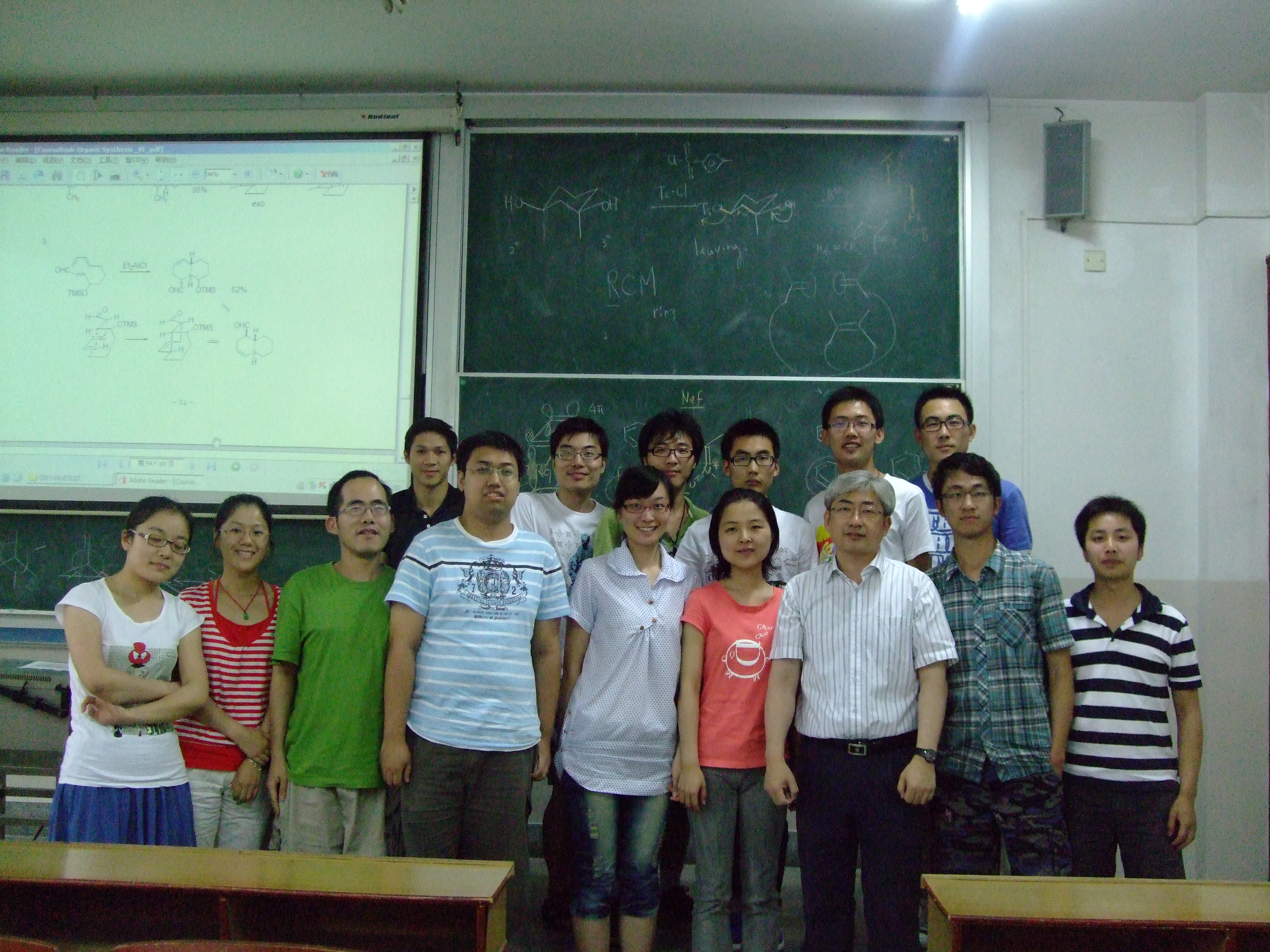 在将近一个星期的的学术讲座中,Sangho Koo 教授向学生讲述了有机合成的方法,并对碳-碳单/双键和环化反应的合成方法做了详尽的介绍,并结合教授本人的研究方向,对其中的硫参与的碳-碳单/双键和合成作了进一步的解释。在碳-碳单键的介绍过程中,着重强调了烯醇化的重要性以及方法。通过对六圆环过渡态和非环状过渡态的分析,对烯醇化过程中会遇到的选择性问题做了细致的比较和解释。在对碳-碳双键的合成方法的阐述中,由ß-取代反应出发,之后介绍了Wittig反应和与其相联系的Schlosser 反应, Horner-Wadsworth-Emmons 反应和Hormer-wittig反应。在环化反应中,强调了Claisen 重排以及其空间选择性的控制。通过轨道理论对Diels-Alder反应,并结合取代基对双烯体和亲双烯体的影响从机理上进行了解释。Sangho Koo 教授的讲座内容丰富多彩,学生对其内容产生了浓厚的兴趣。每次讲座结束后,Sangho Koo 教授多会和学生进行互动探讨交流,并耐心、细致地回答讲座过程的疑问。