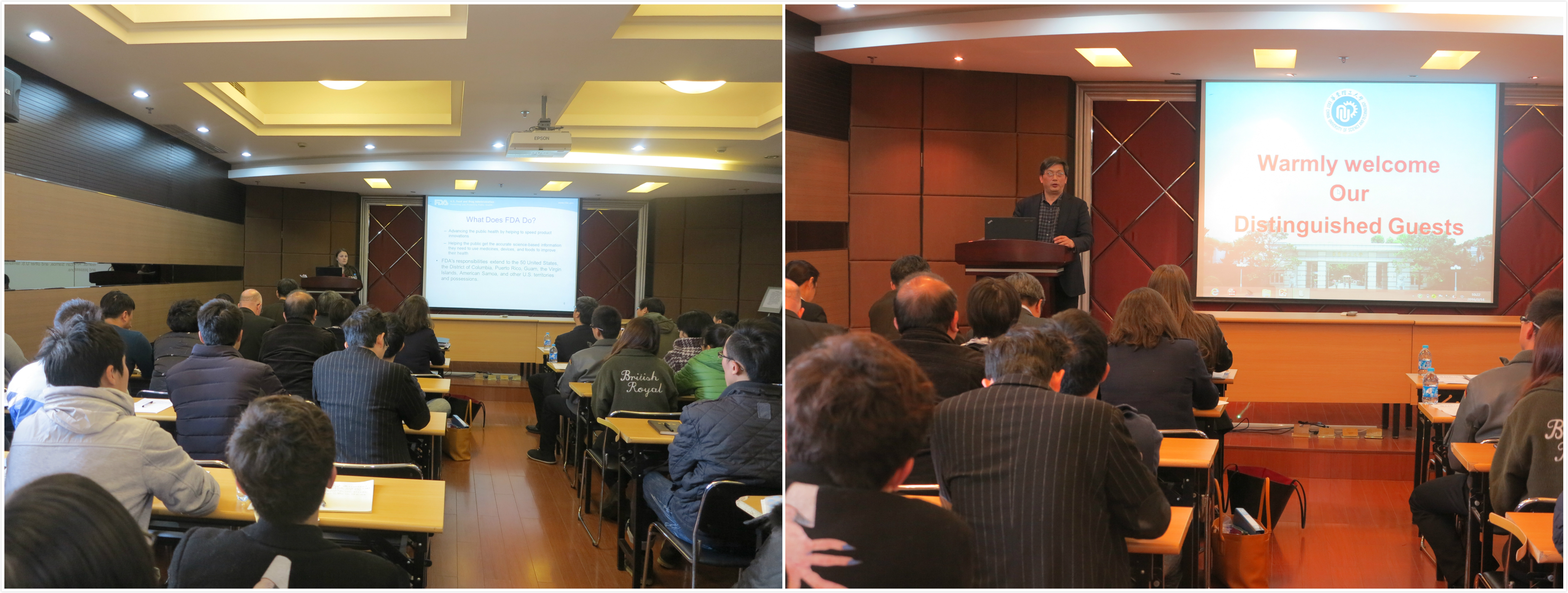 期间,古丽主任作了题为“药品评估研究中心新药审评和工作重点”的报告,对药品评估研究中心(CDER)职能及其运作方式从三个方面进行了介绍:介绍FDA及其下属部门CDER的总体情况,重点解说FDA的组织框架,以及其与药品质量相关部门的职责;介绍2012年新增的加速审批通道——突破性药物审评,确保重要的治疗药物得到批准并尽早为病人所用;介绍CDER重组后的变化及其2016年的工作重点。古丽主任用语平实,解说简明易懂,让师生收获颇多。与会者还踊跃提问,与古丽就相关问题互动交流。