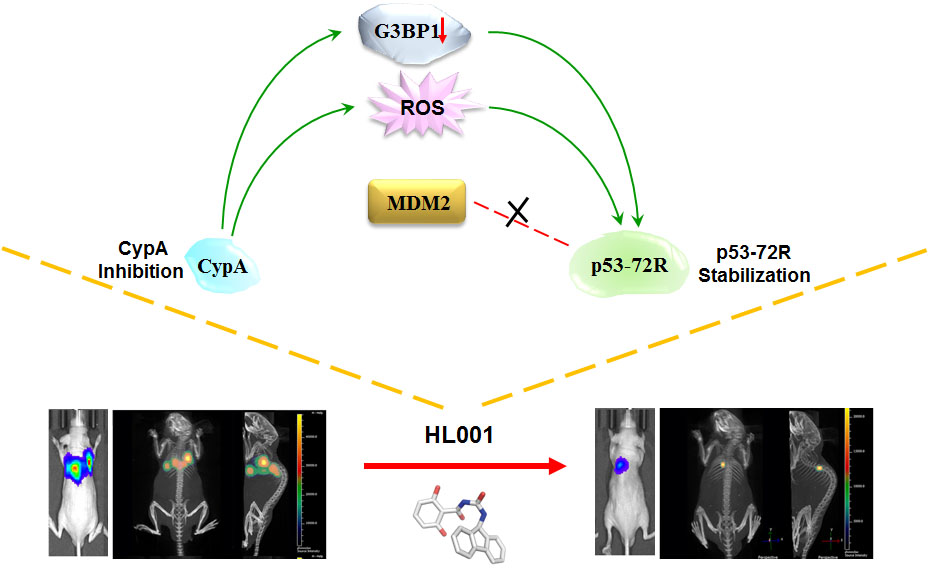 在国家自然科学基金委重大研究计划“基于化学小分子探针的信号转导过程研究”培育项目(90813005)和集成项目(91313303)的进一步资助下,李剑与黄瑾深入合作发现,CypA可通过与G3BP1的相互作用,调节肺癌细胞中抑癌基因p53的功能。CypA 抑制剂HL001可通过诱导野生型p53的表达,显著抑制肺癌细胞的增殖,并首次发现HL001可通过调控CypA/p53 72R/MDM2信号通路,在体内外选择性杀伤p53 72R型肺癌细胞。HL001与化疗药物顺铂联用,在小鼠原位瘤模型中,可以协同强效抑制肺癌A549原位移植瘤的生长。杀伤特定基因型的肿瘤是目前抗肿瘤药物的研发趋势,CypA 抑制剂选择性杀伤肺癌细胞的特性将赋予该类化合物良好的开发潜能,HL001有望成为肺癌精准医疗研究的药物候选物或工具分子(李剑,黄瑾等. CN105326821A)。