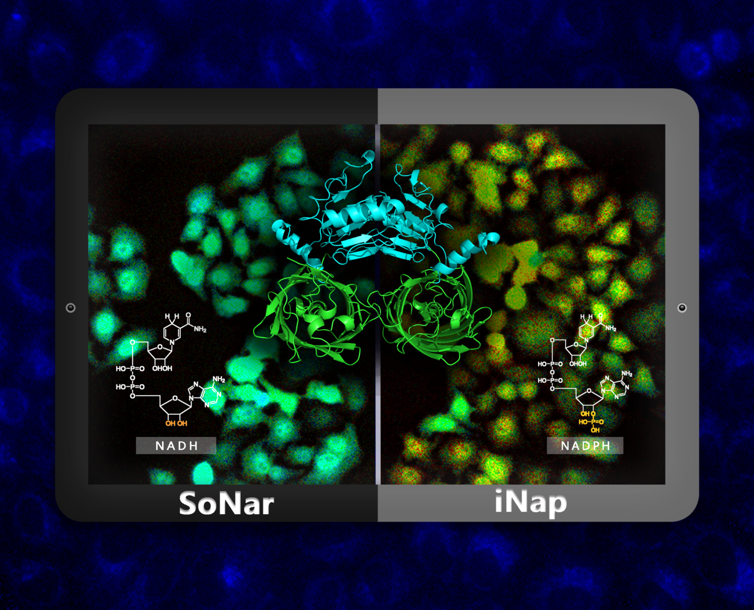 烟酰胺腺嘌呤二核苷酸(NADH/NAD+)及其磷酸化形式(NADPH/NADP+),作为生物体内两对最重要的辅酶和核心代谢物,常被用作评价细胞代谢状态的关键指标,与衰老及相关疾病如癌症、糖尿病、肥胖症、心脑血管疾病、神经性退行性疾病等的发生发展密切相关。长久以来,细胞代谢的检测主要依赖酶学、色谱、质谱等,这些方法不仅破坏了细胞或生物体的完整性,更难以应用于高通量筛选。为了解决这一重要科学难题,2011年,杨弋教授团队利用合成生物学方法开发了一系列遗传编码的NADH荧光探针,实现了在活细胞及各种亚细胞结构中对NADH分子的实时动态、特异性的检测与成像(Cell Metabolism, 2011, 14, 555)。2015年,该团队又报道了可同时检测NAD+,NADH及其比率的第二代细胞代谢荧光探针SoNar,像火眼金睛一样,可察觉到癌细胞与正常细胞的微细代谢差异(Cell Metabolism, 2015, 21,777),并进一步建立了细胞代谢荧光探针在单细胞、活体动物成像及高通量药物筛选方面的系统研究方法(Nature Protocols, 2016,11,1345)。