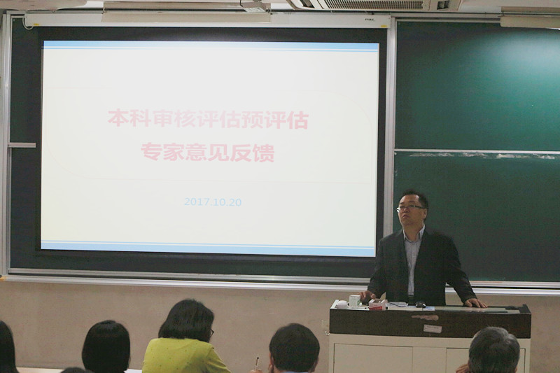 副院长任国宾教授从学校办学定位与培养目标、师资队伍、培养方案、教学过程、两校区办学、国际化等各个方面通报了评估专家的反馈意见。学院本次预审核评估涉及到专家听课、试卷检查、论文检查、全院老师座谈这几个方面,学生座谈和实习基地等几项内容尚未涉及,各教学管理人员、班导师、学工委老师,全体教师要各负其责,全体教师一定要认真学习学校相关机构下发的有关审核评估的材料,学院将根据学校安排组织全体教师按照系所中心进行教学思想大讨论等一系列活动,希望各位老师思想行动起来,以积极向上的姿态迎接正式的审核评估。