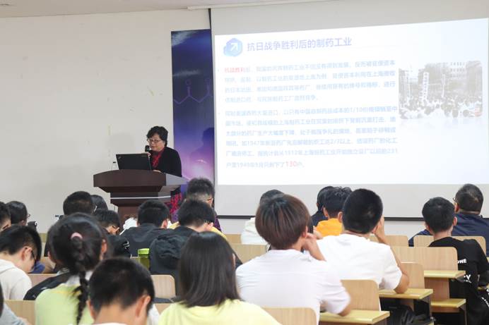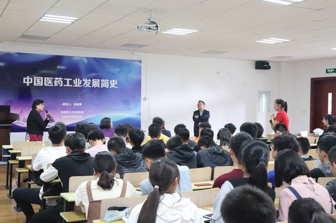 张毓涛从解放前1912年龙虎人丹奠定中国医药工业基础开始,到21世纪屠呦呦获诺贝尔奖,为同学们一一讲述中国医药工业从无到有,从小到大的发展史,以及在发展中所获得的荣耀与经历的困难。当她介绍到在上海生产的,被称为“中国黄”的高纯度四环素时,她骄傲地称这是中国制药技术水平突破的表现,使同学们心中对我国医药工业的自信与自豪感油然而生。她表示,中国医药工业的生命力十分旺盛,即使在抗日与抗战的打击下也能顽强地存活,在解放后特别是改革开放后,国家的政策给医药工业注入资金、人才、技术和管理的力量,使之与国际间的差距不断缩小,并且在关键技术上屡有突破。虽然目前中国只是“制药大国”,但随着全面推行GMP,我国法制的健全与发展环境的不断改善,医药工业的规模在快速增长,质量水平与创新能力显著提高。她鼓励同学们努力学好专业知识,投身科研,使中国医药工业跟上全球步伐,在日趋紧张的国际市场中取得优势,从“制药大国”迈向“制药强国”。