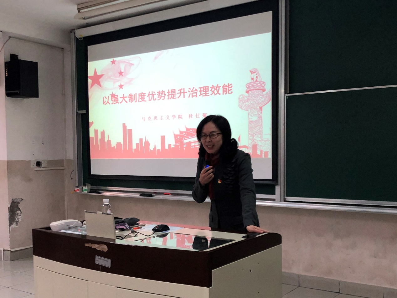 12月13日中午,永利23411集团党委在四教102开展十九届四中全会精神主题学习教育专题报告会。校党的十九届四中全会精神理论宣讲团成员、马克思主义学院院长杜仕菊教授,应邀做了题为“以强大制度优势提升治理效能”的报告。永利23411集团院长宋恭华等班子成员和学院师生参加了报告会,报告会由永利23411集团党委书记张青主持。