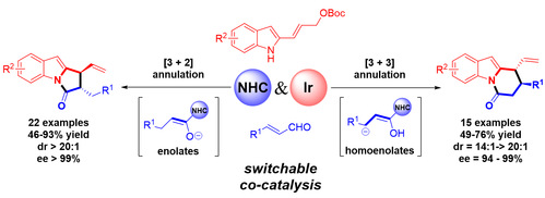 邓卫平课题组设计了一类新型吲哚烯丙基碳酸酯底物,其在金属铱的作用下可以生成吲哚烯丙基铱活性中间体。通过对体系碱性的调控,该活性中间体能够成功地实现对同一烯醛生成的烯醇式或高烯醇式中间体的选择性捕捉,以良好的收率、优秀的区域选择性和立体选择性得到了手性吡咯[1,2-a]并吲哚(46%-93% yield; >99% ee, >20:1 dr)和吡啶[1,2-a]并吲哚(49%-76% yield; 94-99% ee, 14:1->20:1 dr)两种稠环吲哚产物,进一步的底物适用性考察发现环丙烷甲醛这一烯醇式前体也可以兼容该体系,从而合成得到了结构多样的手性吡咯[1,2-a]并吲哚产物(40%-75% yield; >99% ee, >20:1 dr)。此外,通过简单改变氮杂卡宾和金属铱配体的绝对构型可以方便地获得产物的全部四种立体异构体。详细的机理研究确认了烯丙基铱活性中间体结构,同时DFT理论计算为解释该反应优秀的区域和立体选择性提供了有力证据。上述研究工作丰富了过渡金属与有机催化剂协同催化体系,尤其发展为氮杂卡宾参与的不对称协同催化反应提供了借鉴意义。