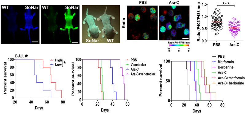 本研究利用遗传编码NADH/NAD+探针SoNar的转基因工具鼠,发现B-ALL 细胞主要以氧化磷酸化作为其主要能源(图2)。SoNar低的 B-ALL 细胞具有增强的线粒体呼吸能力,倾向于驻留在血管壁中,并且比 SoNar高的细胞中的功能性白血病起始细胞富集更多。SoNar低的细胞比SoNar 高的细胞对B-ALL一线用药 Ara-C 具有更高抵抗力。临床样本中,SoNar低的人原代 B-ALL 细胞也偏爱氧化磷酸化,并且对 Ara-C 处理有抵抗力。用 3 种药物(维奈托克、二甲双胍、小檗碱)抑制氧化磷酸化作用,无论在体内还是体外,都能很好减弱 Ara-C 诱导的耐药性(图2)。本研究为理解代谢特性与 B-ALL 细胞的命运决定之间的潜在联系以及开发针对癌症耐药性的治疗策略提供了有效的工具和独特的视角。目前针对B细胞急性淋巴细胞白血病的联合用药方案,我校以第一单位已申请国家发明专利(专利名称:癌症治疗靶点及其用途,申请号:202110262093.5)。