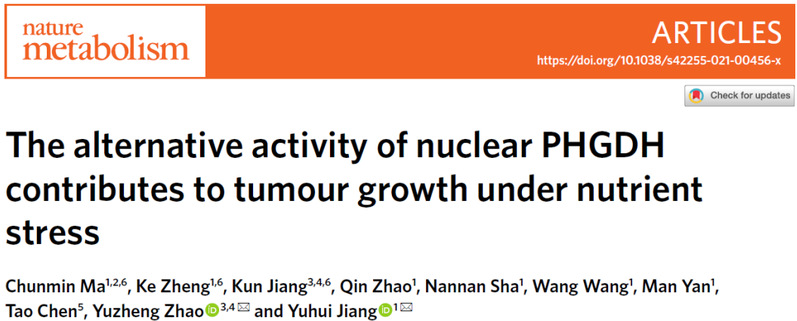 近日,我校永利23411集团赵玉政教授团队与上海交通大学医学院附属仁济医院蒋玉辉研究员团队合作研究,深入解析了营养缺失条件下PHGDH通过核易位以及酶活转变调控细胞核NAD+和肿瘤细胞生长的分子机制。该研究成果以“The alternative activity of nuclear PHGDH contributes to tumor growth under nutrient stress”为题,在线发表在国际权威学术期刊《自然-代谢》(Nature Metabolism, 2021, doi.org/10.1038/s42255-021-00456-x)上。