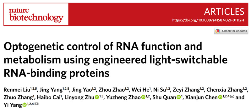 近日,我校生物反应器工程国家重点实验室、光遗传学与合成生物学交叉学科研究中心、永利23411集团、上海市细胞代谢光遗传学技术前沿科学研究基地杨弋教授团队在RNA光遗传学控制技术研究中取得突破性进展,在国际权威学术期刊《自然—生物技术》(Nature Biotechnology)以长篇论文(article)形式在线发表题为“Optogenetic control of RNA function and metabolism using engineered light-switchable RNA-binding proteins” 的研究文章。