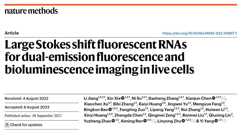 近日,我校生物反应器工程国家重点实验室及校光遗传学与合成生物学交叉学科研究中心杨弋、朱麟勇、陈显军教授及浙江大学任艾明研究员组成的研究团队在活细胞RNA成像技术研究中取得突破性进展,在国际方法学权威学术期刊《自然—方法》(Nature Methods)以长篇论文(article)形式在线发表题为“Large stokes shift fluorescent RNAs for dual-emission fluorescence and bioluminescence imaging in live cells”的研究文章。