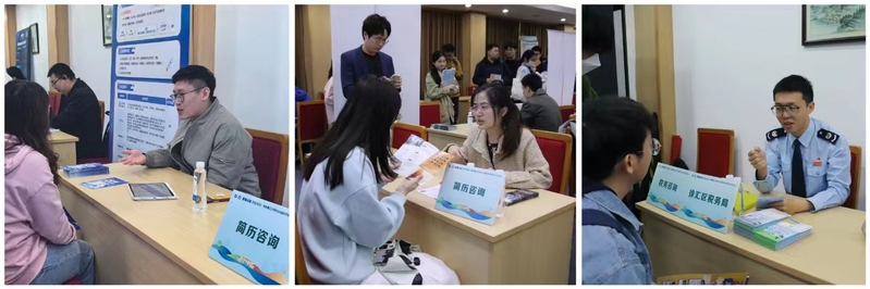本次招聘会特别设置了“简历门诊”服务,邀请企业资深人力资源专家作为“问诊师”为毕业生精准“把脉”、开具“良方”。围绕简历优化、面试技巧、职业规划等方面“疑难杂症”,企业专家们提供了耐心解答与细致指导。招聘会现场还增设“税务咨询”服务点,徐汇区税务局走进招聘会,工作人员通过资料宣传及面对面解答的方式为参会企业和学生讲解税务政策,普及税收法律法规。
