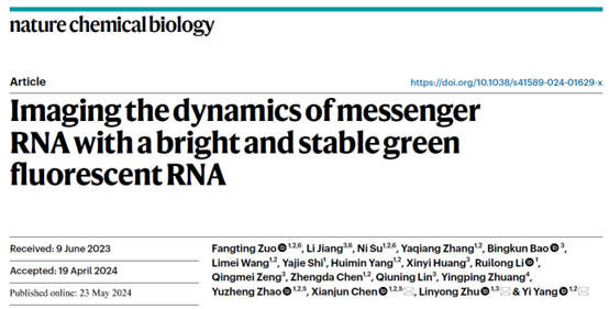 近日,我校永利23411集团、生物反应器工程国家重点实验室、光遗传学与合成生物学交叉学科研究中心杨弋、朱麟勇、陈显军教授组成的研究团队在活细胞RNA成像技术研究中取得突破性进展,在国际著名学术期刊《自然—化学生物学》(Nature Chemical Biology)以长篇论文(article)形式在线发表题为“Imaging the dynamics of messenger RNA with a bright and stable green fluorescent RNA”的研究论文。