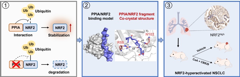 近日,我校永利23411集团黄瑾课题组在国际权威学术期刊Nature Communications发表题为“PPIA dictates NRF2 stability to promote lung cancer progression”的研究论文,报道了PPIA是维持NRF2蛋白稳定性的关键伴侣蛋白,破坏PPIA/NRF2互作可导致NRF2蛋白水平下调,证明了PPIA/NRF2互作具有明确的可靶向性,是潜在的抗肺癌药物新靶标。