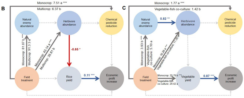 为检验文章中提出的联动链理论的科学性和准确性,作者首先对稻田田埂种植大豆/玉米系统,进行了联动链理论效果检测;经结构方程模型检验,作物多样性增加了稻田天敌、减少了害虫,进而减少了杀虫剂用量、增加了水稻产量且增加了经济效益。紧接着,作者对花菜与水产动物共生系统进行了结构方程模型检验,发现这种多样化模式同样产生联动链趋势(见图6)