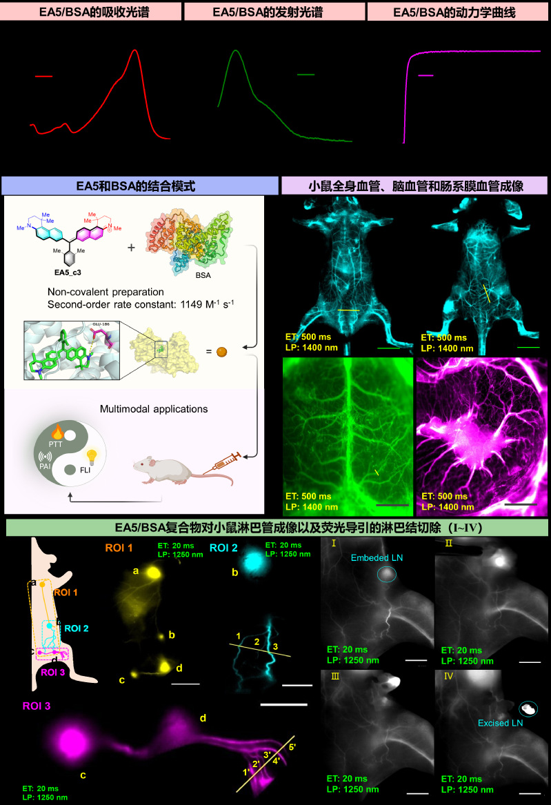 BSA/EA5复合物经小鼠尾静脉注射后,潴留在小鼠全身血管网络;经皮下组织注射,可进入小鼠淋巴系统,从而实现小鼠血管系统、淋巴系统的高分辨率近红外二区荧光成像。利用BSA/EA5复合物的光热效应,还实现了小鼠皮下及原位肿瘤的光声成像以及肿瘤的光热治疗(如图1所示)。为生物医学成像和治疗提供高生物兼容性、高性能新分子体系,有望应用于肿瘤诊断和治疗。