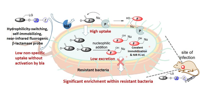 近日,我校永利23411集团谢贺新教授课题组在活体动物耐药细菌感染荧光成像研究方面取得了重要进展,相关成果以“Highly Sensitive In Vivo Imaging of Bacterial Infections with a Hydrophilicity-Switching, Self-Immobilizing, Near-Infrared Fluorogenic β-Lactamase Probe Enriched within Bacteria”为题发表于Advanced Science。