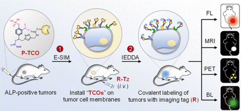 此外,谢贺新教授课题组与南京大学叶德举教授团队、江苏省原子医学研究所林建国研究员团队合作,在预靶向多模态活体动物肿瘤成像取得最新进展,相关成果以“Pretargeted Multimodal Tumor Imaging by Enzymatic Self-Immobilization Labeling and Bioorthogonal Reaction”为题发表在Journal of the American Chemical Society。该研究以研究团队前期发展的碱性磷酸酶自锚定探针(Chem. Eur. J. 2019, 25, 13994)为预靶向基团,通过亚甲基苯醌中间体的形成将反式环辛烯(TCO)选择性共价标记在活体动物肿瘤细胞膜上,进而通过快速的生物正交反应,将含有四嗪的各种信号报告基团(如荧光染料、磁纳米粒子、放射性核素、生物发光蛋白等)选择性富集在肿瘤细胞中,从而实现对活体小鼠肿瘤的高灵敏荧光、核磁共振、正电子发射断层及生物发光等多模态成像。南京大学博士研究生缪银杏、副研究员王宇琦、yl23411集团博士研究生陈叶锋为论文共同第一作者,谢贺新、林建国和叶德举为论文共同通讯作者。