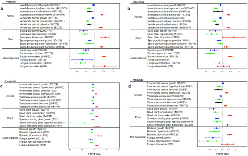 图3:农药影响无脊椎/有脊椎动物、单子叶/双子叶植物、真菌/细菌的全球试验结果