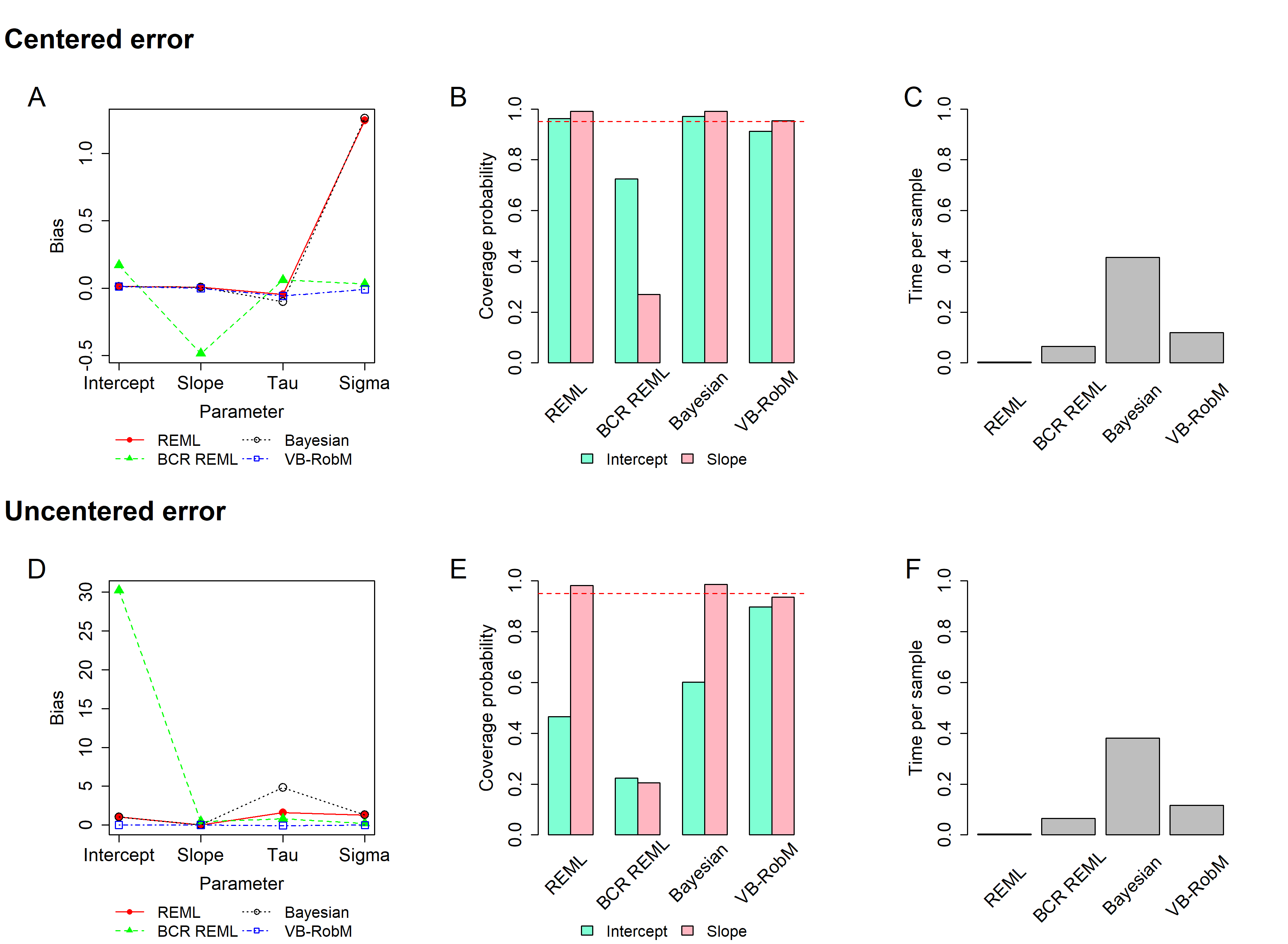 在模拟研究中,VB-RobM 在不同模拟场景下均展现出更低的参数估计偏倚、更优的置信区间覆盖率以及更短的计算时间。这表明,相较于传统的 SEM 方法,VB-RobM 具有更高的估计精度和更强的鲁棒性;而相比多元贝叶斯方法,它在保证准确性的同时大幅提升了计算效率。