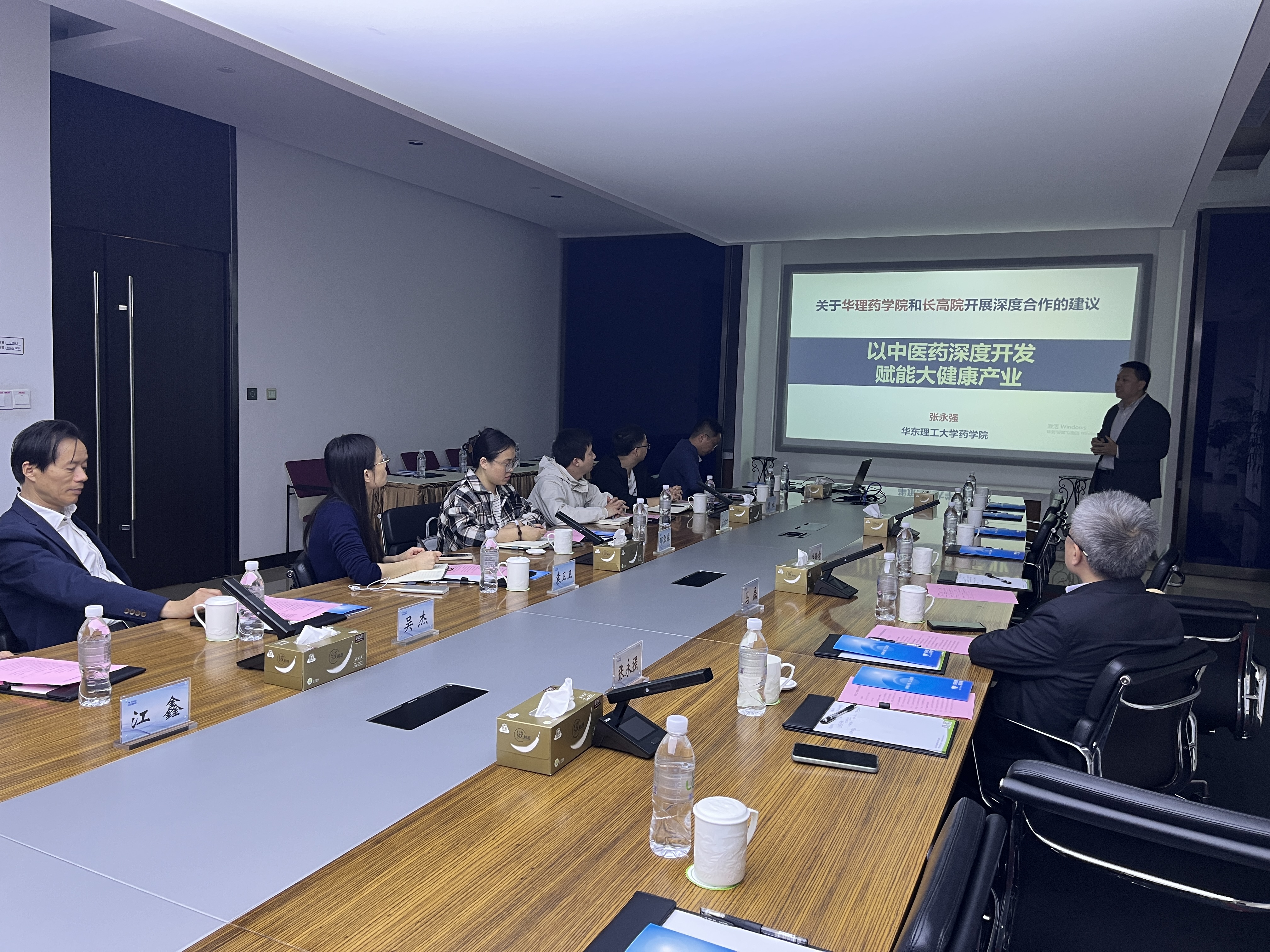 随后,双方进行了会议交流。马磊在会上表示,永利23411集团一直致力于推动产学研深度融合,今年学院与长三角药物高等研究院已经完成了首批联合培养工程硕士的招生工作,希望双方能够继续保持紧密的合作关系,争取在合作项目、人才培养等领域尽快取得实质性成效。张永强分享双方共同探索中医药深度开发的新路径,为大健康产业注入新的活力的思考和建议。他指出永利23411集团在药物设计、药物化学、药理学、药物分析等方面有着很好的科研背景,并且近年学院在中医药深度开发领域有着许多突出成果,能够为企业在相关领域的研发工作提供良好的技术和人才支持。随后,双方就后续校地合作模式、资源共享机制及未来发展方向进行了深入探讨。江苏崇恒医疗科技有限公司总经理汪六一、泉养堂(江苏)生物医药有限公司总监陈晓丹、江苏巴帝恩生物科技有限公司研究所副所长詹柱、江苏冬泽特医食品有限公司质量负责人李志峰、江苏神猴医药研究有限公司质量负责人席慧珍等参与本次交流。