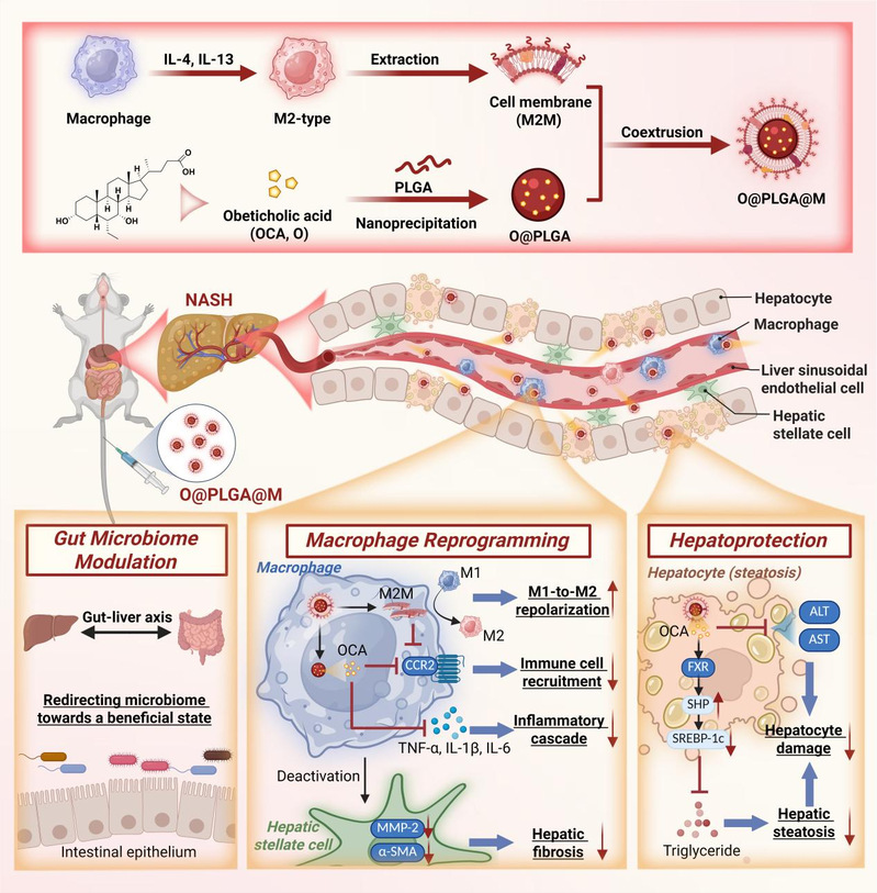为解决这一问题,该研究首次构建了M2巨噬细胞膜仿生纳米递药平台(O@PLGA@M),利用其对炎症部位的趋化性,将奥贝胆酸靶向递送至肝炎病灶。同时,M2巨噬细胞膜可将促炎的M1巨噬细胞重编程为抗炎的M2表型,与奥贝胆酸协同发挥调节脂质代谢、抗炎、抗纤维化及肝保护作用,重塑肝脏微环境。此外,O@PLGA@M还能通过肠肝轴调节肠道微生物群,进一步缓解NASH病理症状。该研究对推动奥贝胆酸的临床转化以及NASH肝脏微环境调控具有重要意义。