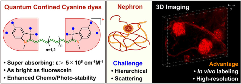 近日,永利23411集团钱旭红院士、杨有军教授团队构建了基于“电场量子限域效应”的超吸收花菁染料。该研究工作提出了一种用于提升染料摩尔消光系数的理性设计方法,对Cy3/5/7/9四个系列的染料进行合理分子改造,成功构建一个摩尔消光系数高(亮度高)、稳定性好的花菁染料库,并成功实现小鼠肾脏组织高精度三维成像。相关成果以“Super-Absorbing Quantum-Confined Cyanine Dyes for Near-Infrared Confocal Imaging of Hierarchical Nephron Structures”为题发表在J. Am. Chem. Soc.(https://doi.org/10.1021/jacs.5c13660)上。