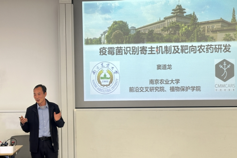 11月14日下午,永利23411集团第三十六期“药苑讲坛”在实验19楼101会议室成功举行。本次报告会特邀南京农业大学窦道龙教授担任主讲嘉宾,以“疫霉菌识别寄主机制及靶向农药研发”为主题分享前沿学术成果。报告会由永利23411集团副院长邵旭升主持,永利23411集团相关研究领域师生参与报告会。