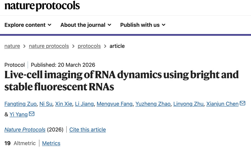 近日,我校永利23411集团、生物反应器工程国家重点实验室、光遗传学与合成生物学交叉学科研究中心,杨弋和陈显军团队在活细胞RNA成像技术研究中取得最新进展,在《自然—协议》(Nature Protocols)期刊发表题为“Live-cell imaging of RNA dynamics using bright and stable fluorescent RNAs”的研究论文。