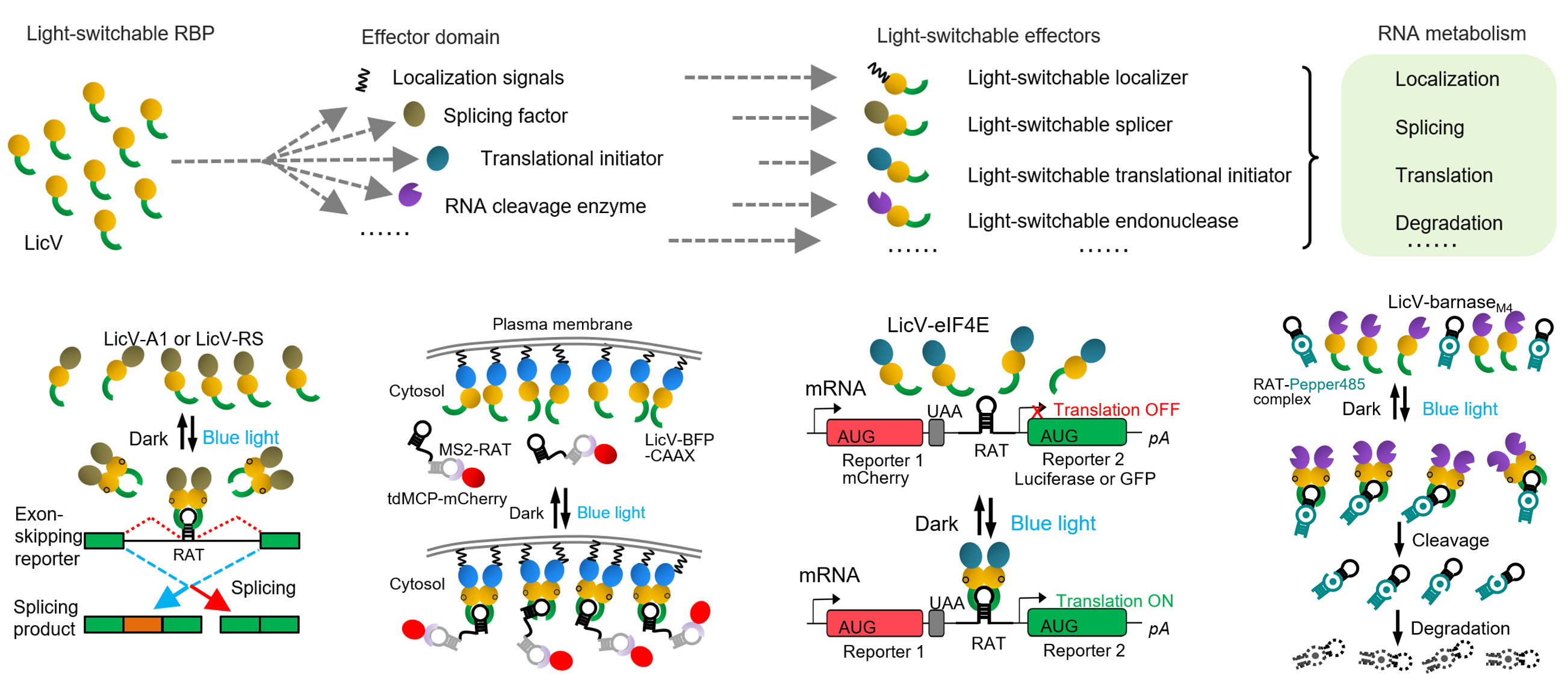 --------------------------------------------------------------------------------------------------------------------------------------------------- Optogenetic control of RNA function and metabolism using engineered light-switchable RNA-binding proteins RNA像蛋白质一样具有复杂的高级结构与相互作用,复杂而精确地执行丰富多彩的生物学功能。与蛋白质研究相比,人们对细胞内RNA时间空间分布及其功能的研究目前仍然有一定滞后,其中一个重要的原因是目前仍缺乏可以在活细胞内对RNA分子进行高时空分辨精密控制的技术。针对这一亟需解决的技术挑战,我们基于合成生物学及光遗传学原理并结合全新的高通量筛选策略成功构建了LicV系列光控RNA效应因子,实现了动物细胞内RNA生成、剪接、运输、翻译、降解等代谢活动的时空精密控制。LicV与CRISPR-Cas系统结合而成的LA-CRISPR系统,可具有更高的激活效率与更低的非特异性。LicV系列光控RNA效应因子与我们前期发展的Pepper技术结合,可在活细胞上对RNA进行时间和空间尺度的闭环监测与控制,为深入探究单细胞内RNA的功能和复杂调控机制提供极具价值的创新研究工具。(Nature Biotechnology 2022, 40, 779-786;Nature Protocols 2023, online)