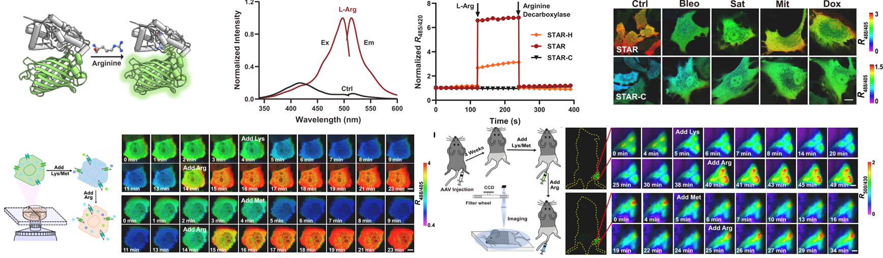 --------------------------------------------------------------------------------------------------------------------------------------------------- Lighting up arginine metabolism reveals its functional diversity in physiology and pathology 精氨酸是氨基酸中的“多面手”,不仅参与了蛋白质合成,也可分解产生一氧化氮、肌酸等一系列重要体内代谢物,还是氮平衡、尿素循环、血管舒张、免疫反应、肿瘤发生等多种生理病理过程的调节因子。然而,传统的生化方法难以进行原位、实时、动态、在体的分析。我们构建了一个高性能、遗传编码的精氨酸荧光探针“STAR”,成功实现了在单细胞及活体水平对精氨酸代谢的特异、灵敏地实时动态监测,并系统研究了精氨酸在氨基酸交换转运、巨噬细胞命运转变、基质细胞衰老调控及免疫疾病精准诊断中的重要作用(Cell Metabolism 2025, 37, 291).